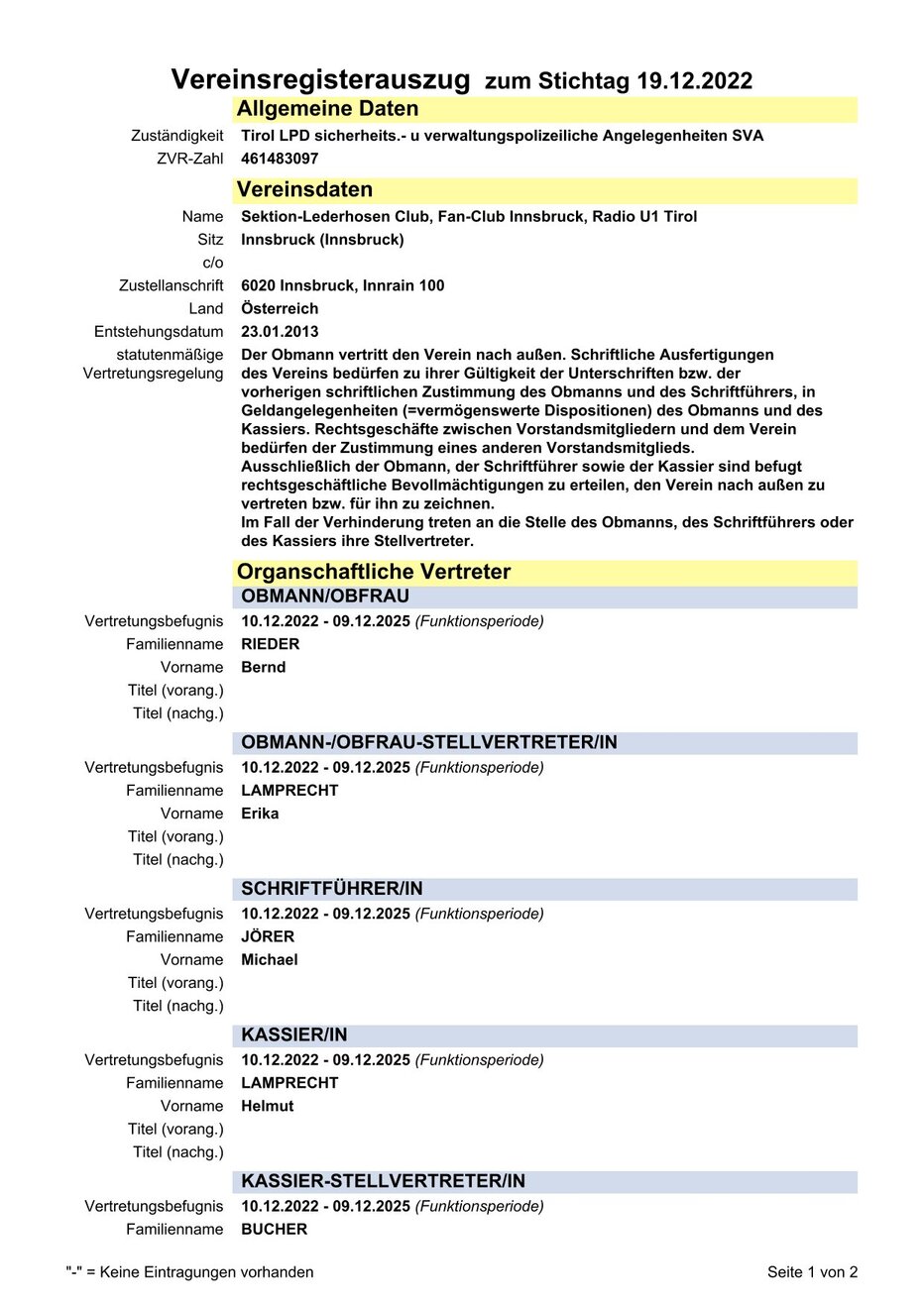 Vereinsregisterauszug 2022 - Fanclub Innsbruck, Radio U1 Tirol